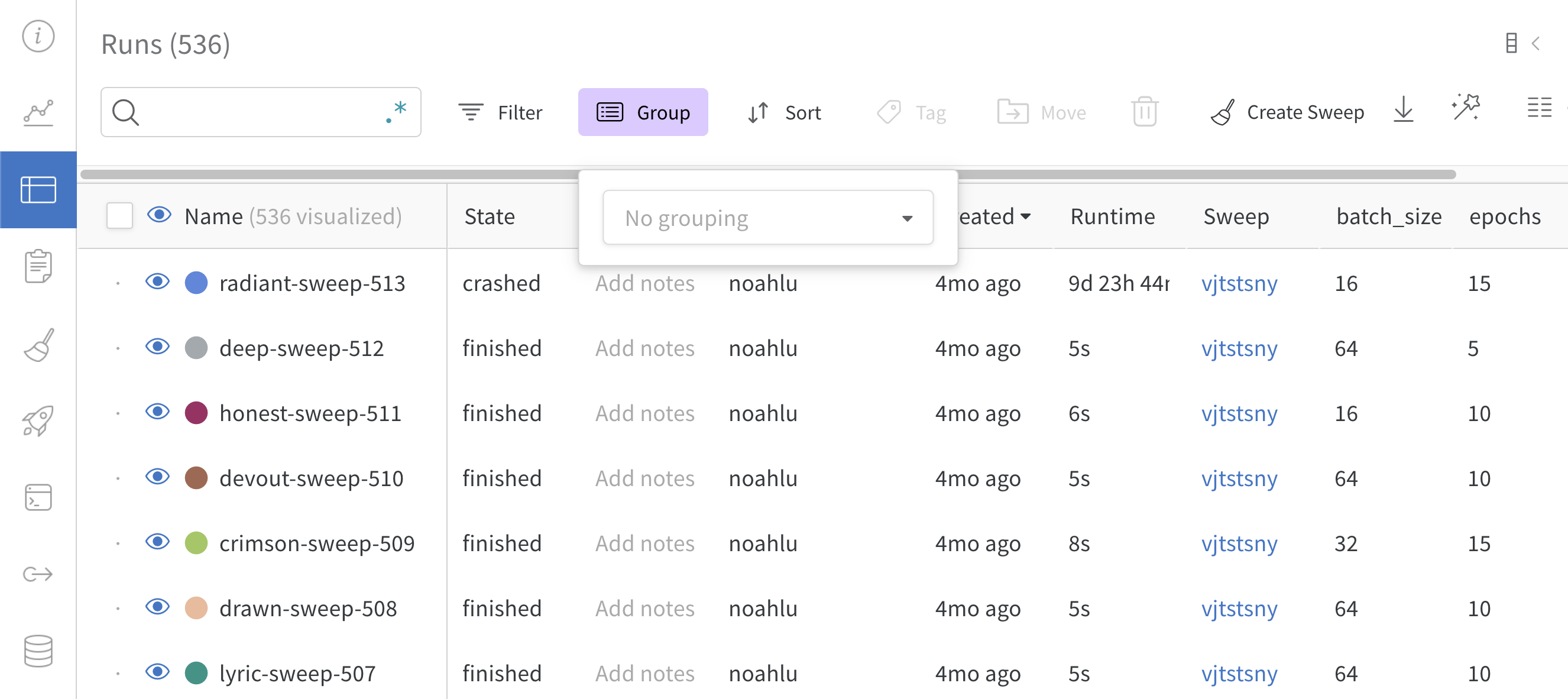 - ソート: 最小の損失や最大の精度など、runをソートする値を選択。ソートにより、グラフに表示されるrunが変わります。